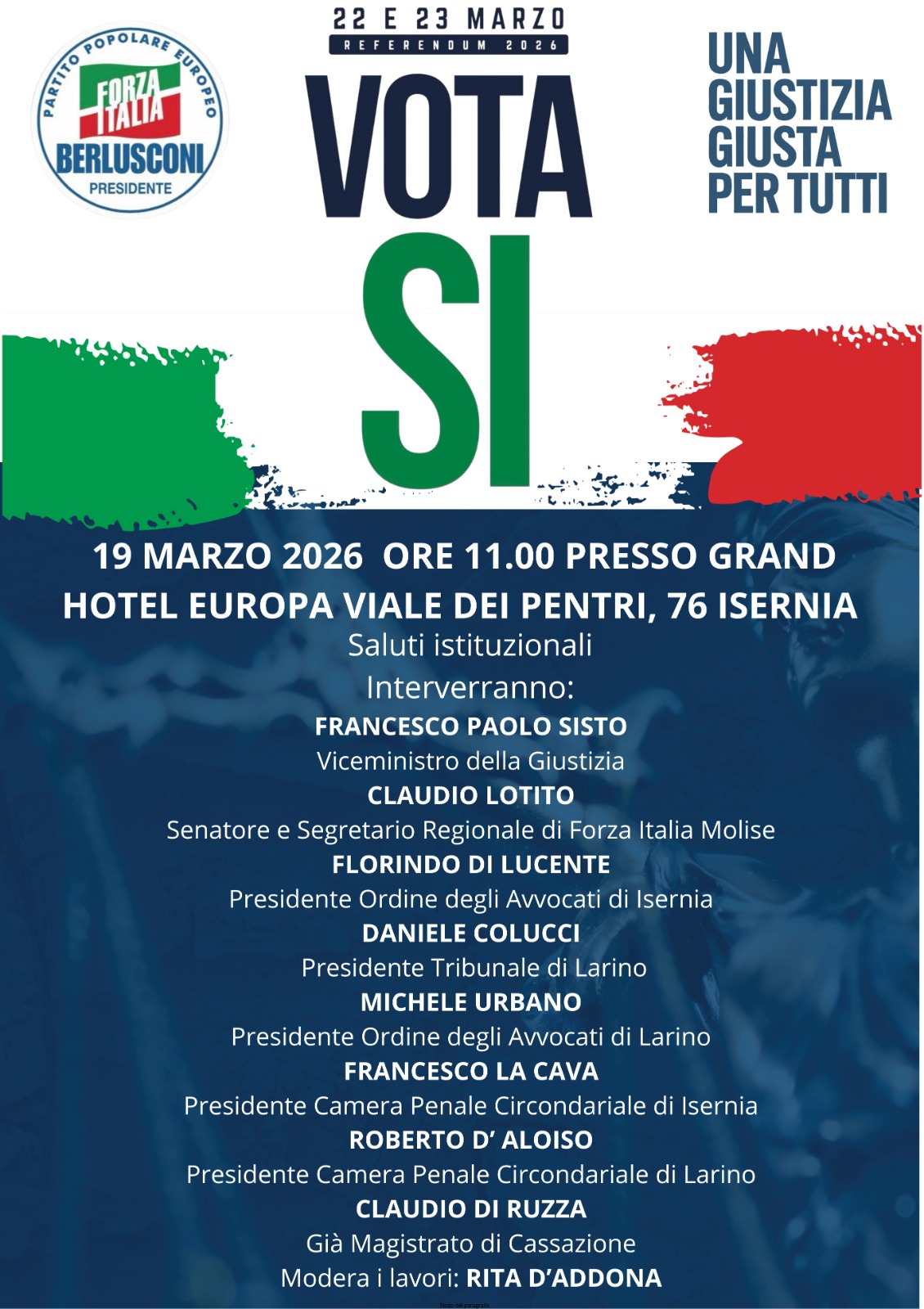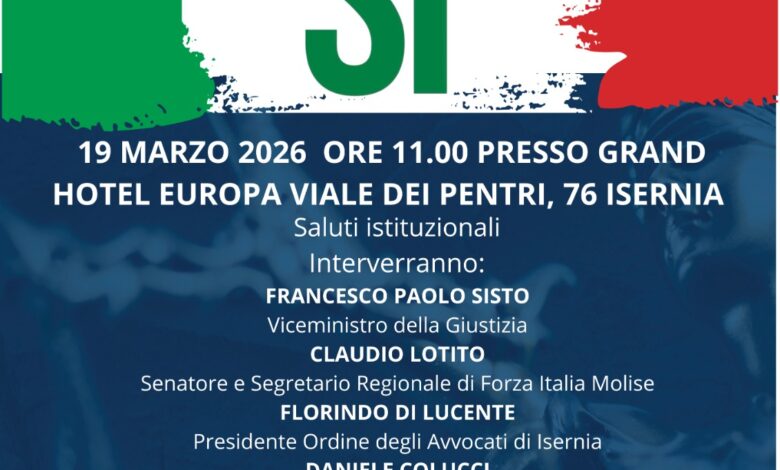 Un momento di confronto pubblico su uno dei temi centrali del dibattito politico nazionale: la giustizia. In vista del Referendum del 22 e 23 marzo 2026, si terrà giovedì 19 marzo 2026 alle ore 11, presso il Grand Hotel Europa di Isernia, un incontro istituzionale dal titolo “Una giustizia giusta per tutti”, promosso dal partito di Forza Italia in Molise.