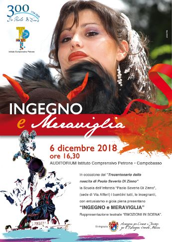 La scuola dell’infanzia di Campobasso, intitolata a Paolo Saverio Di Zinno, nell’ambito delle celebrazioni del tricentenario della nascita dell’artista e scultore del capoluogo del Molise, promuove l’iniziativa ‘Ingegno e Meraviglia’ con una rappresentazione teatrale ‘Emozioni in scena’ ed una mostra fotografica, creata dai bambini, sui 13 Misteri, (13 quadri scenici viventi o Ingegni sulla storia della Salvezza).