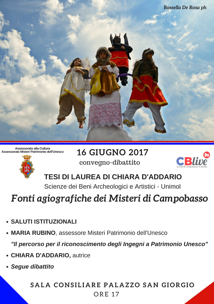 Una tesi sugli Ingegni del Di Zinno dal titolo ‘Fonti agiografiche dei Misteri di Campobasso’, discussa dalla campobassana Chiara D’Addario nella seduta di laurea del Corso in Scienze dei Beni Archeologici e Artistici dell’Università degli Studi del Molise.