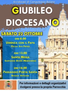 Saranno oltre 600 i fedeli delle parrocchie dell’arcidiocesi di Campobasso–Bojano che, accompagnati dai loro parroci e dal vescovo GianCarlo Bregantini raggiungeranno piazza San Pietro a Roma, per assistere all’Udienza Giubilare presieduta da Papa Francesco. Sabato 22 ottobre 2016 dalle ore 9:45 alle ore 11:15 tutti i fedeli della diocesi si uniranno alla folla internazionale che in questo Anno Santo della Misericordia riempirà la Piazza in occasione della Memoria Liturgica di san Giovanni Paolo II e di altri eventi giubilari tra i quali il Giubileo delle Corali e il cammino dei giovani delle Confraternite d’Italia, per incontrare il Papa. A conclusione dell’Udienza Papale i sei sacerdoti della diocesi che in questo anno (2016) hanno celebrato il loro 50° (don Michele Stasi, don Saverio Di Tommaso, don Ugo Iannadrea) il 25° (don Rocco Di Filippo e diacono Cincindella Giovanni) anniversario di ordinazione sacerdotale, riceveranno in dono il “baciamano” papale.