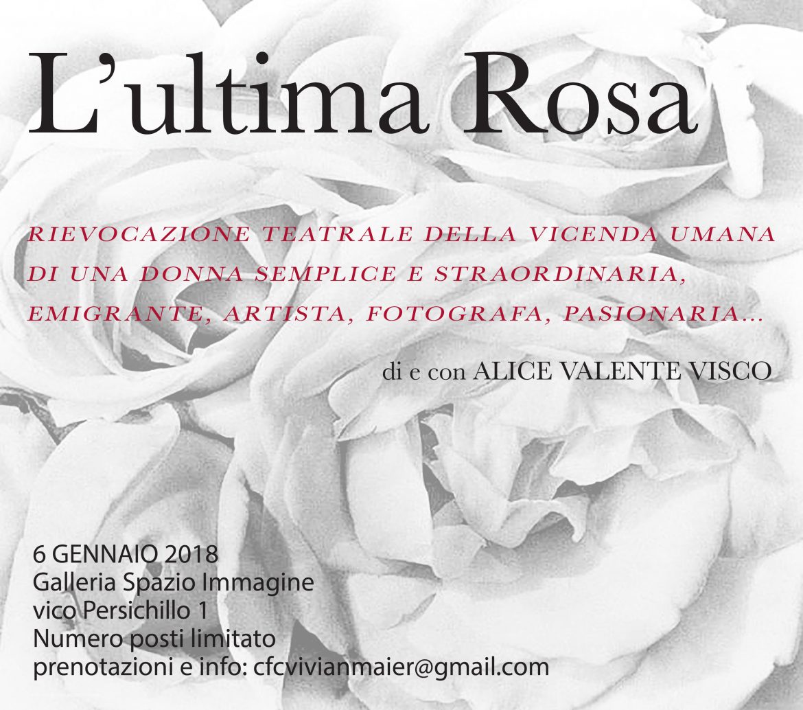 locandina l'ultima rosaIn concomitanza con l’anniversario della morte di Tina Modotti avvenuta a cavallo tra il 5 e 6 Gennaio del 1942, il 6 gennaio 2018 negli spazi della galleria Spazio Immagine, nell’ambito della mostra fotografica “Tina Modotti – fotografa e rivoluzionaria”, l’attrice Alice Valente Visco interpreta “L’Ultima Rosa” un testo teatrale da lei scritto che rievoca le passioni e lo spirito di una donna semplice e rivoluzionaria.