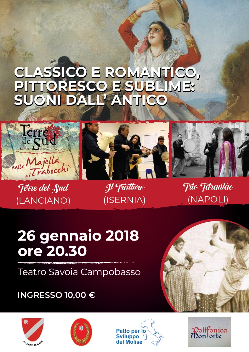 ‘Classico e Romantico, Pittoresco e Sublime: suoni dall’antico’ è lo spettacolo, organizzato dalla Polifonica Monforte, che vedrà al Teatro Savoia l’esibizione dei gruppi folk ‘Le terre del Sud’ di Lanciano, ‘Il Tratturo’ di Isernia e il ‘Trio Tarantae’ di Napoli.