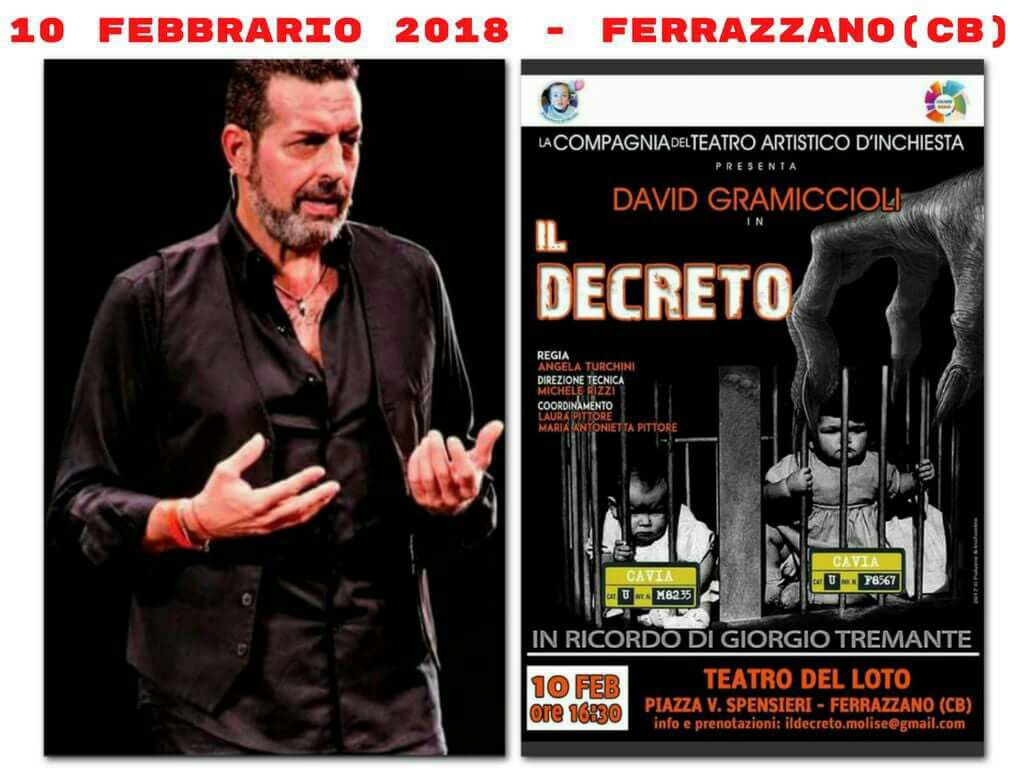 Sabato 10 febbraio 2018, alle ore 16,30 al teatro del Loto a Ferrazzano, la “Compagnia del Teatro Artistico d’Inchiesta”, con David Gramiccioli, presenta ‘Il Decreto’, andato in scena in tutta Italia e con molta soddisfazione il ‘Comitato Liberamente Noi: Liberi e Informati genitori Molise’ è riuscito a portarlo anche nella nostra regione.