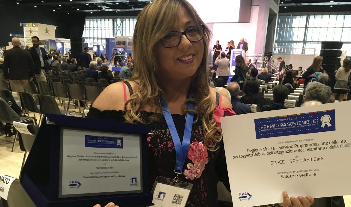 Nel corso del convegno “Italia 2030: come portare l’Italia su un sentiero di sviluppo sostenibile” tenutosi nell’ambito del ForumPA 2018 a Roma presso l’ Arena Convention Center “La Nuvola” ,il Direttore del Servizio Programmazione Rete dei soggetti deboli e dell’integrazione socio sanitaria della Regione Molise, Avv. Alberta De Lisio, è stata premiata nell’ambito del “Premio Nazionale PA sostenibile 100 progetti per raggiungere gli obiettivi dell’Agenda 2030”