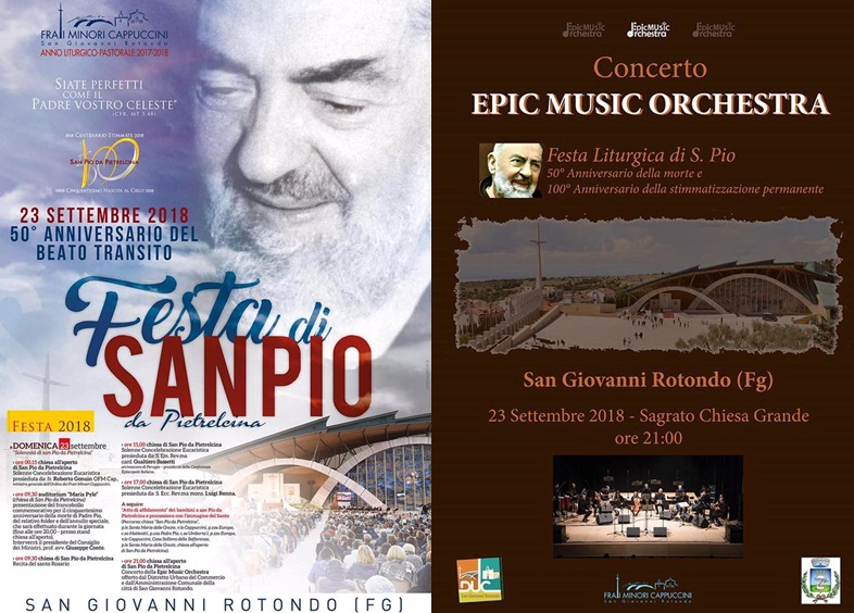 Sarà un grande concerto. Quasi due ore di musica davanti a cinquemila pellegrini arrivati a San Giovanni Rotondo, in provincia di Foggia, da tutta Italia e anche dall’estero. Toccherà alla “Epic Music Orchestra” chiudere la Festa Liturgica di San Pio, la sera del 23 settembre alle 21, con una performance musicale sul Sagrato della Chiesa Grande.