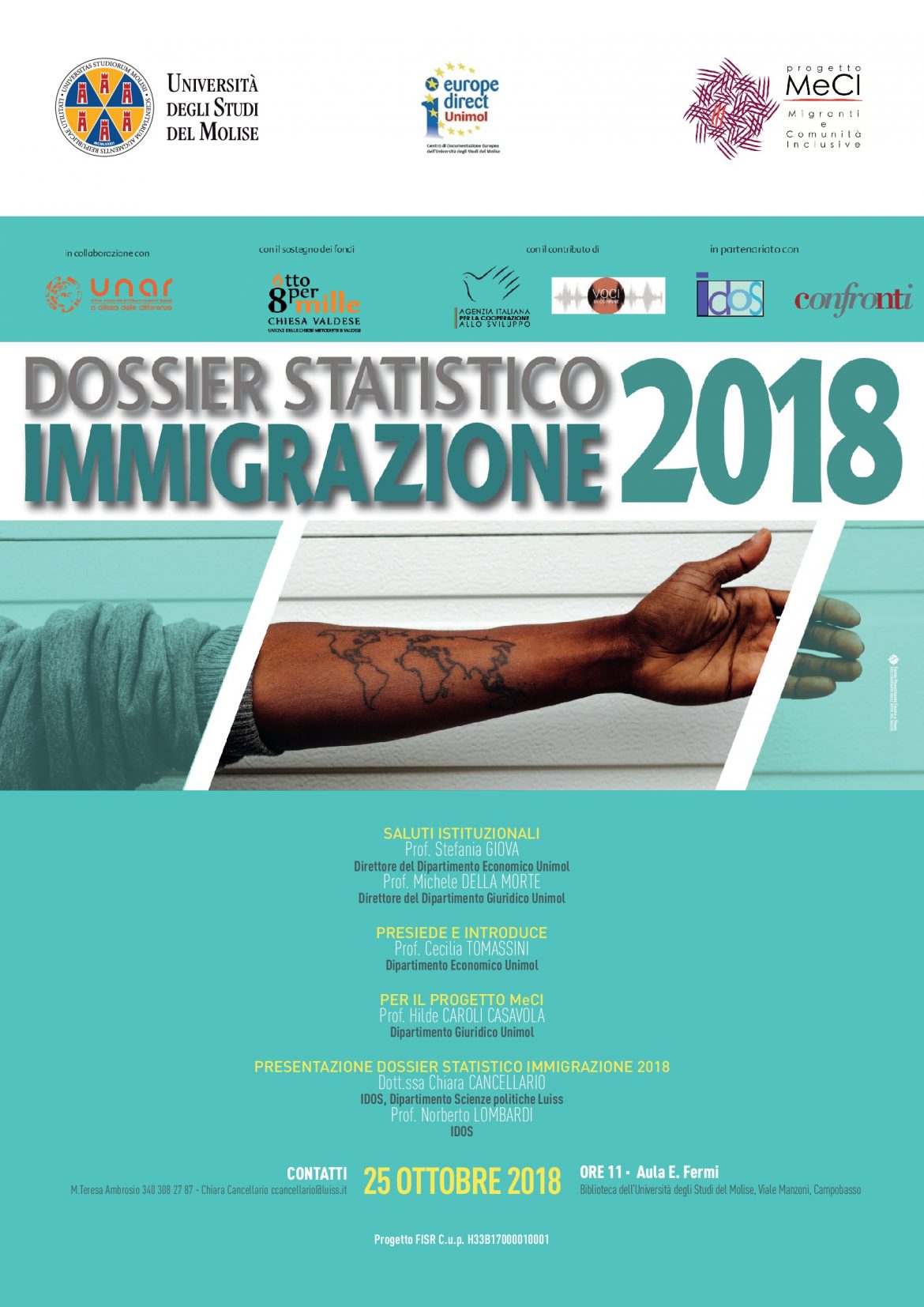 La presentazione del Dossier a Campobasso è stata organizzata grazie alla collaborazione dell’Università degli Studi del Molise, nell’ambito del progetto MeCI – Migranti e Comunità Inclusive, finanziato con il fondo FISR (Fondo integrativo speciale per la ricerca) del MIUR.