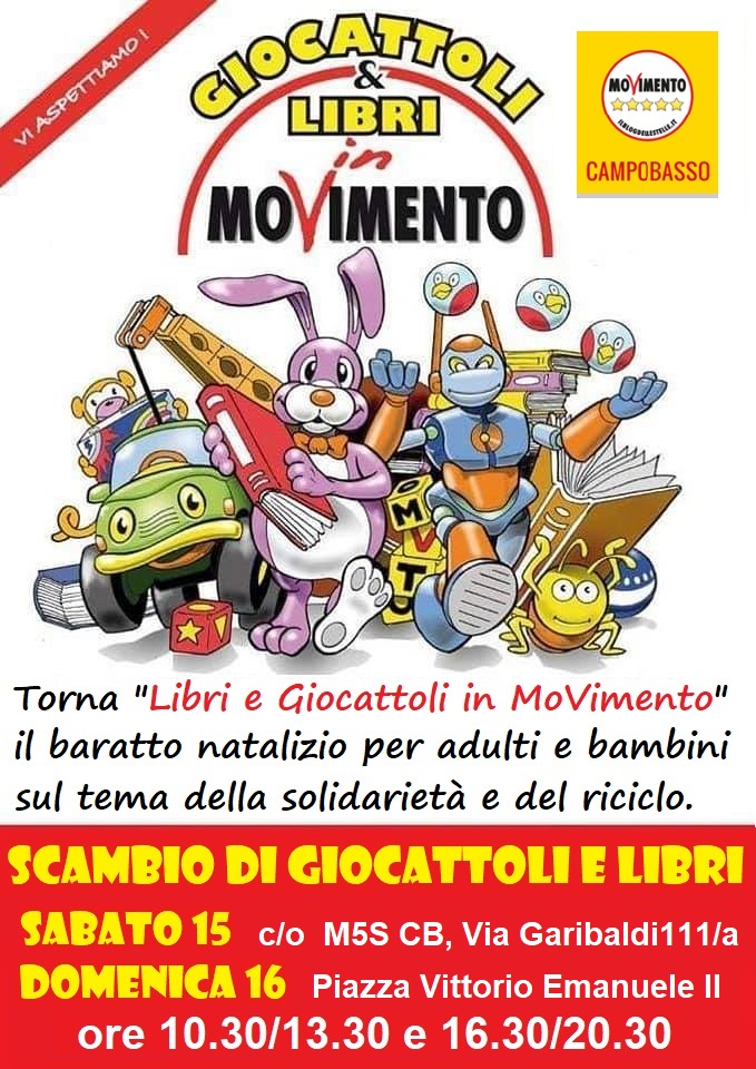 Secondo weekend per “Giocattoli e Libri in MoVimento”, il tradizionale mercatino del baratto di giocattoli e libri organizzato dal M5S Campobasso.