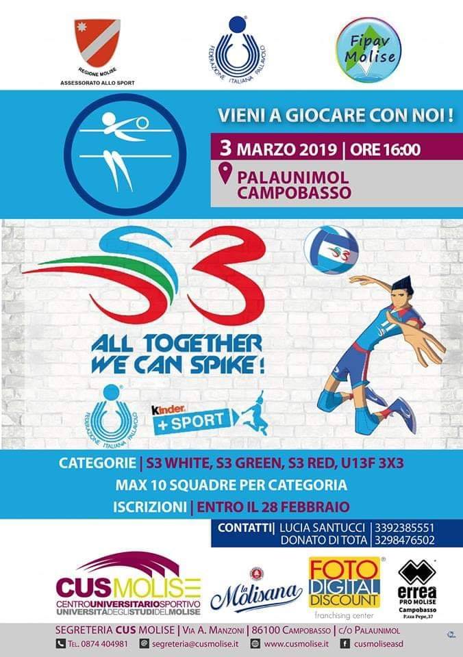 La manifestazione Volley S3 sbarca al Cus Molise. Saranno diverse le società provenienti da tutta la regione che domenica pomeriggio, 3 marzo 2019, si sfideranno in un mini torneo all’insegna dello sport e del divertimento.