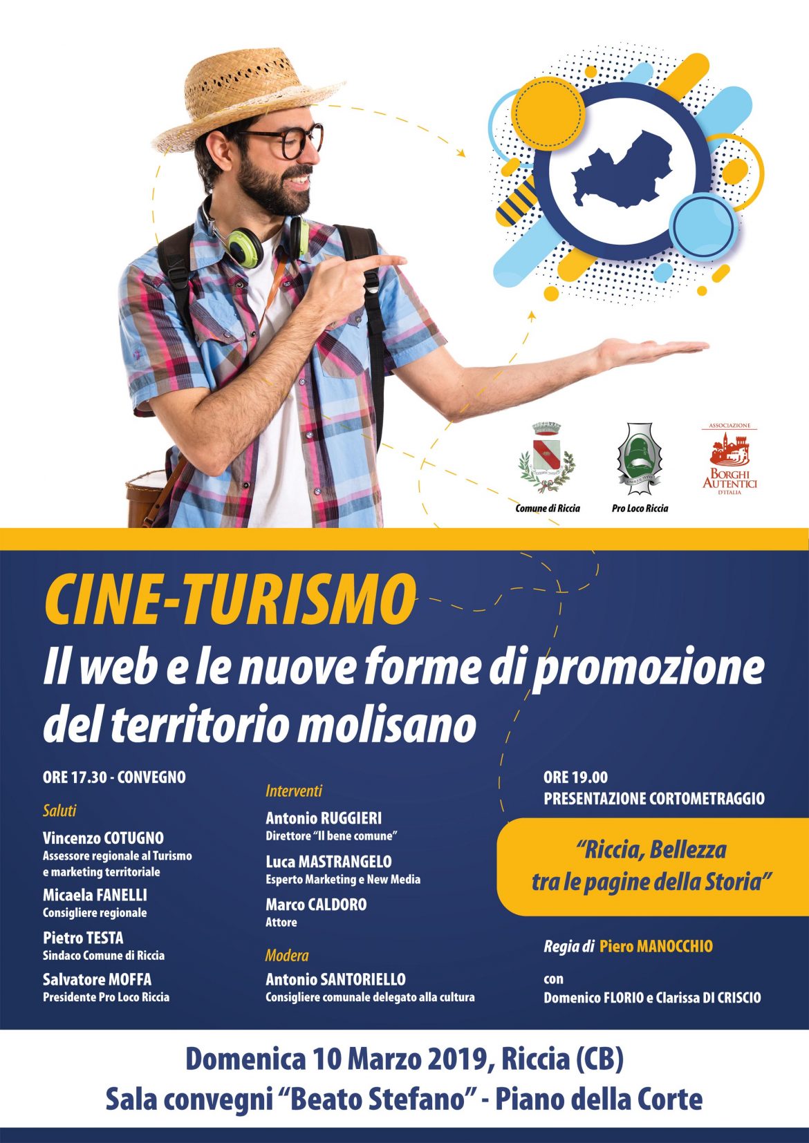 Al Convegno, dopo i saluti istituzionali del sindaco Pietro Testa, dell’Assessore al Turismo Vincenzo Cotugno, della consigliera regionale di Riccia, Micaela Fanelli, e del Presidente della locale Pro Loco Salvatore Moffa, ne dibatteranno Antonio Ruggieri, direttore del mensile “Il Bene Comune”, Luca Mastrangelo, esperto di marketing e new media e l’attore molisano Marco Caldoro.