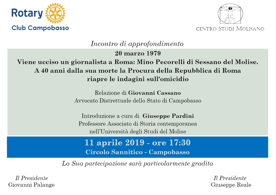 Quanto al programma dell’evento, dopo i saluti da parte del Presidente del Rotary, Dott. Giovanni Palange, e del Presidente del Centro Studi Molisano, Prof. Giuseppe Reale, i lavori verranno introdotti dal Prof. Giuseppe Pardini, Docente di Storia contemporanea nell’Università degli Studi del Molise, che illustrerà le caratteristiche ed i momenti salienti di quel particolare periodo storico, approssimativamente ricompreso fra la fine degli anni ‘60 e gli inizi degli anni ’80, nel cui contesto si colloca la tragica vicenda del giornalista molisano.