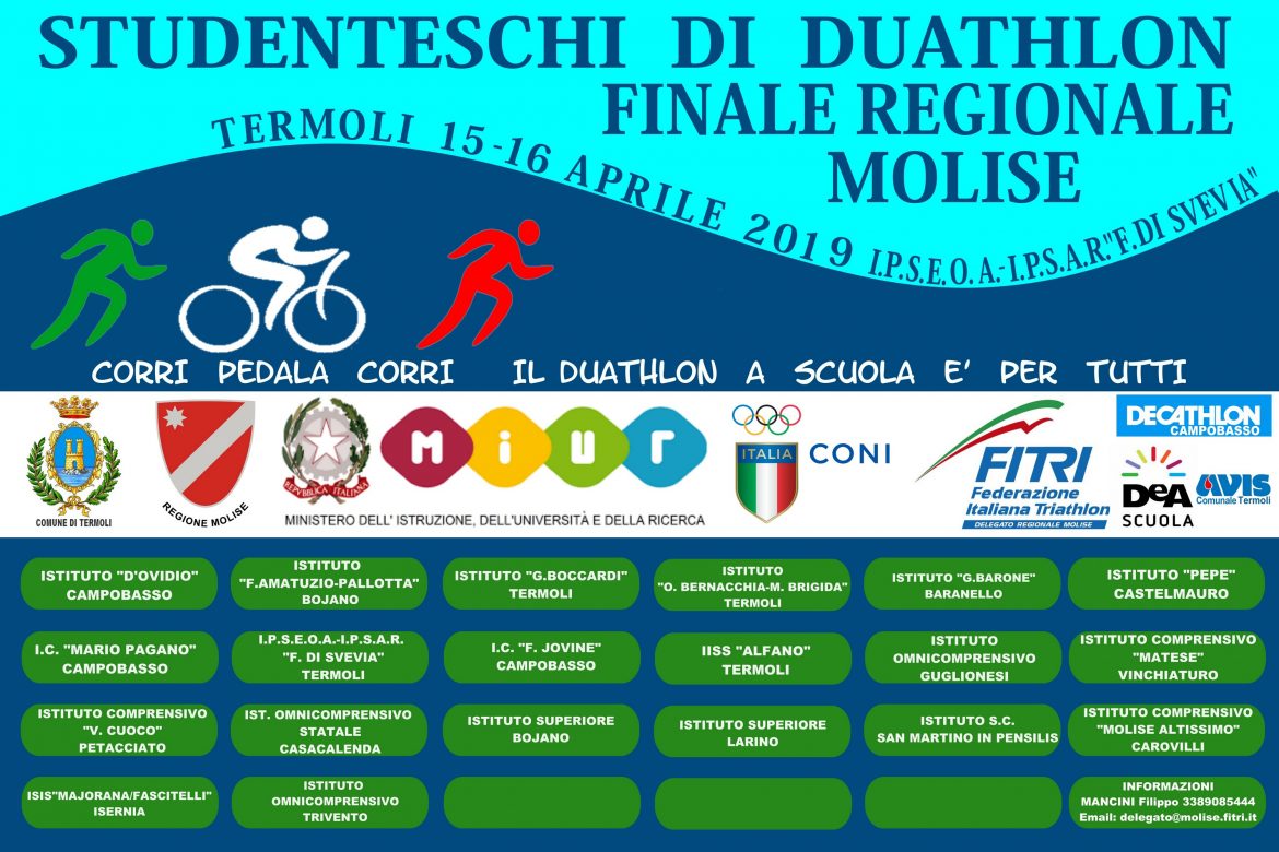 La Federazione Italiana Triathlon delegazione molisana, in collaborazione con CONI, MIUR regionale, i partner Decathlon e Avis Comunale Termoli, organizza il 16 e 17 aprile 2019 dalle ore 9:30 alle 13:30, nelle aree di pertinenza dell’Istituto Alberghiero “F. di Svevia” di Termoli, la Finale Regionale dei Campionati Studenteschi di Duathlon, sport multidisciplinare senza interruzione, consistente in 200 mt di corsa, 800 mt di Mtb e 200 mt finali di corsa.