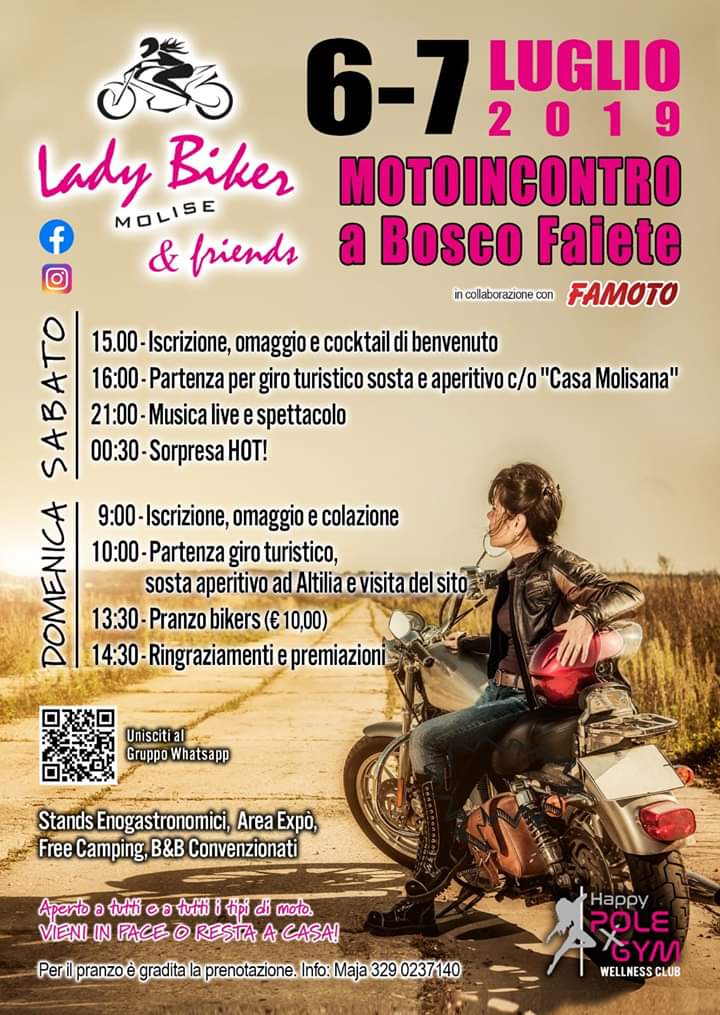 Stands enogastronomici, area expò, musica, giochi e tante sorprese! Tutto questo sarà il moto-incontro a Bosco Faiete organizzato da Lady Biker Molise & Friends nel prossimo week-end. Prevista una massiccia partecipazione di motociclisti, soprattutto molisani, ma anche provenienti da fuori regione.