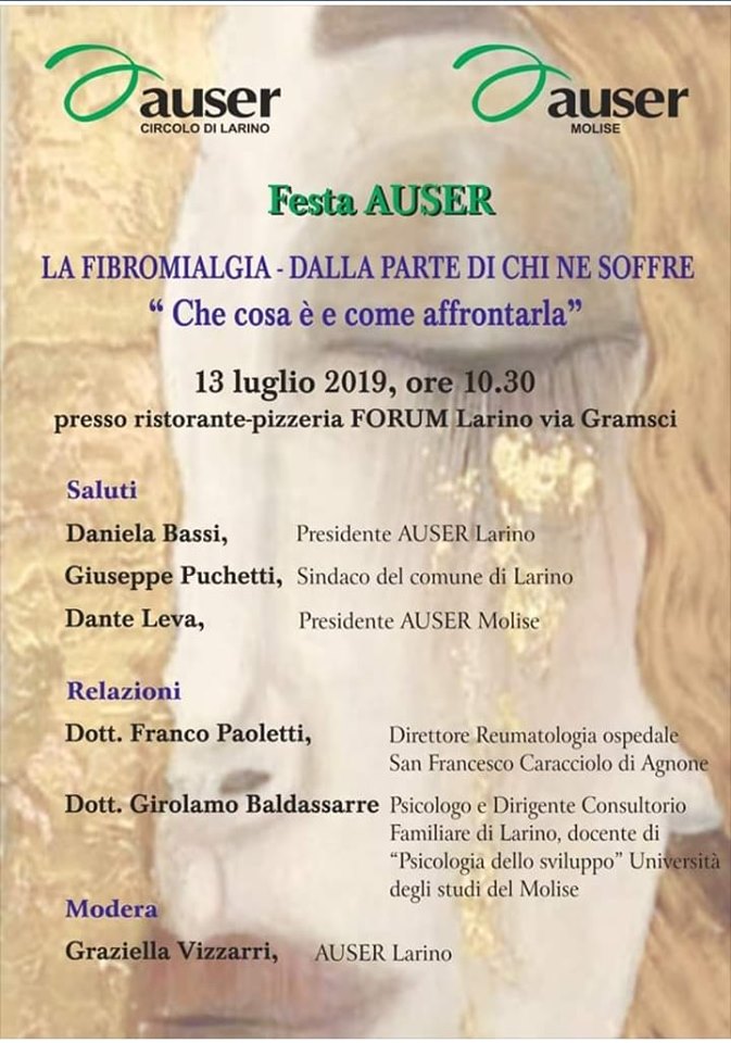 L’incontro dal titolo “LA FIBROMIALGIA: DALLA PARTE DI CHI NE SOFFRE “Che cos’è e come affrontarla”, aperto al pubblico e moderato da Graziella Vizzarri, Auser Larino, si terrà alle ore 10.30 presso il Ristorante-pizzeria “Forum” che dopo i saluti di rito della Presidente dell’Auser Circolo di Larino Daniela Bassi, Il Sindaco del Comune di Larino Giuseppe Puchetti e Dante Leva, Presidente AUSER Regione Molise si addentrerà con forte interesse nel vivo del tema.