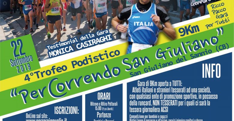 Il paesino dell’entroterra molisano molto vicino al capoluogo regionale ostenta fierezza e rivendica due dei maggiori esponenti e amanti del running. Tanto più quando la corsa entra nella leggenda e la leggenda passa per San Giuliano del Sannio. Domenica 22 Settembre 2019 dalle ore 15 a San Giuliano del Sannio, in Piazza Libertà, si svolgerà la 4^ edizione del Trofeo Podistico PerCorrendo San Giuliano – gara podistica sulla distanza di 9Km, fortemente voluta da Giancarlo Benevento dal 2016 che vedrà la partecipazione quale Testimonial della Gara Monica Casiraghi, ultramaratoneta, campionessa mondiale 100 km anno 2003 (Taiwan), Campionessa Europea 100 km anno 2003 (Mosca) record Italiano 7.28.12, Campionessa Europea 100 km anno 2005 (Passatore Firenze-Faenza), Campionessa Europea 100 km anno 2006 (Winchothen Olanda), Vice Campionessa Europea 24h anno 2007 (Madrid), Medaglia Bronzo Campionato del Mondo 24 h anno 2009 (Bergamo), Vice Campionessa Mondiale 24h anno 2010 (Brive Francia), Record Italiano 231 km, Campionessa Italiana 100 km anno 2010 (Seregno) e da ultimo vittorie alla 100km Etna Extreme e la King of Island 160km tutto il perimetro dell’Elba in 28.57.53.