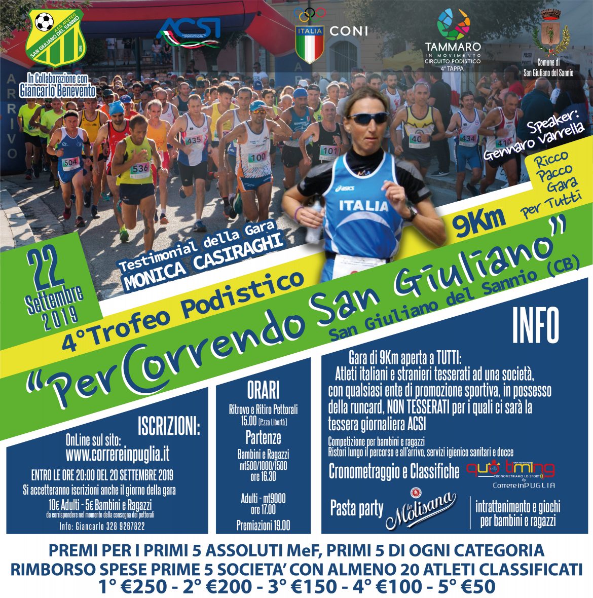 Il paesino dell’entroterra molisano molto vicino al capoluogo regionale ostenta fierezza e rivendica due dei maggiori esponenti e amanti del running. Tanto più quando la corsa entra nella leggenda e la leggenda passa per San Giuliano del Sannio. Domenica 22 Settembre 2019 dalle ore 15 a San Giuliano del Sannio, in Piazza Libertà, si svolgerà la 4^ edizione del Trofeo Podistico PerCorrendo San Giuliano – gara podistica sulla distanza di 9Km, fortemente voluta da Giancarlo Benevento dal 2016 che vedrà la partecipazione quale Testimonial della Gara Monica Casiraghi, ultramaratoneta, campionessa mondiale 100 km anno 2003 (Taiwan), Campionessa Europea 100 km anno 2003 (Mosca) record Italiano 7.28.12, Campionessa Europea 100 km anno 2005 (Passatore Firenze-Faenza), Campionessa Europea 100 km anno 2006 (Winchothen Olanda), Vice Campionessa Europea 24h anno 2007 (Madrid), Medaglia Bronzo Campionato del Mondo 24 h anno 2009 (Bergamo), Vice Campionessa Mondiale 24h anno 2010 (Brive Francia), Record Italiano 231 km, Campionessa Italiana 100 km anno 2010 (Seregno) e da ultimo vittorie alla 100km Etna Extreme e la King of Island 160km tutto il perimetro dell’Elba in 28.57.53.