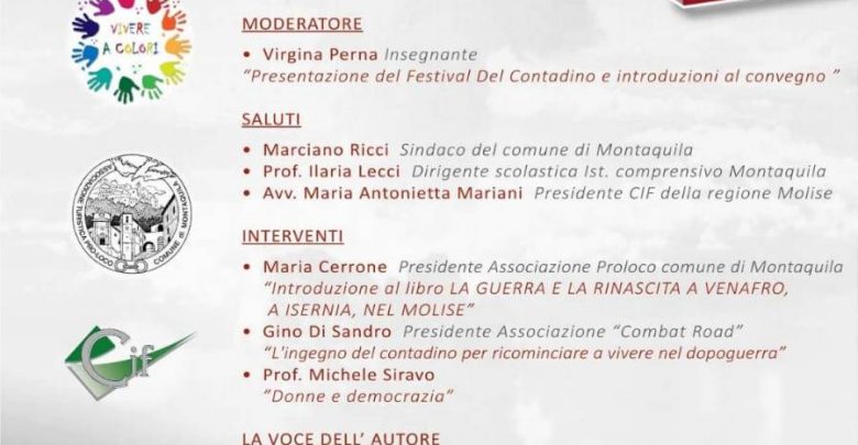 Il convegno sarà moderato dall’insegnante Virgina Perna che presenterà anche il programma del festival, dopodiché ci saranno i saluti del sindaco di Montaquila Marciano Ricci, della dirigente scolastica dell’istituto comprensivo di Montaquila Ilaria Lecci e della presidente del Cif Molise Maria Antonietta Mariani. Interverranno poi la presidente della proloco di Montaquila Maria Cerrone, il presidente dell’associazione ‘Combat Road’ e il docente Michele Siravo.