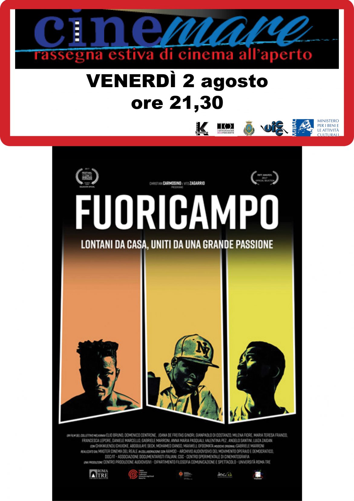 Stasera, 2 agosto,con inizio delle proiezioni alle 21,30, presso la storica sede del cortile della Oddo Bernacchia, in via Gioberti, nel centro della cittadina adriatica, è il turno di Fuoricampo, un film realizzato dal collettivo Melkana, che vuole raccontare, attraverso le vicende della Liberi Nantes F.C. (terza categoria), una storia di integrazione. La squadra, infatti, è composta da rifugiati e richiedenti asilo, ma non può vincere, per regolamento, il campionato.