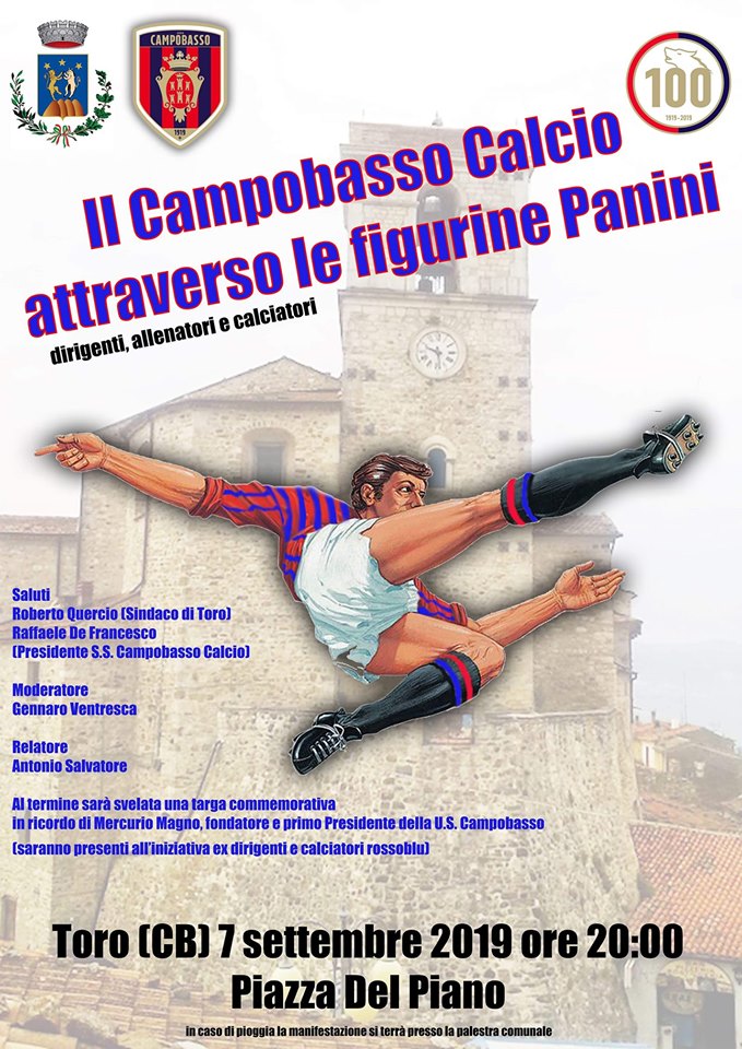 “Il Campobasso Calcio attraverso le figurine Panini” si terrà sabato 7 settembre alle ore 20 in Piazza del Piano a Toro. L’iniziativa rientra nelle celebrazioni dei 100 anni di storia rossoblù ed è patrocinata dal Comune di Toro.