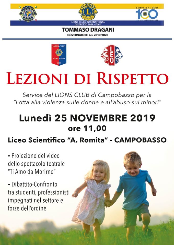 Il Lions Club Campobasso, nell’ambito del Service Lions “Lotta alla violenza sulle donne e all’abuso sui minori”, il 25 novembre 2019 alle ore 11 al Liceo Scientifico ‘A. Romita’ di Campobasso, realizzerà l’incontro Lezioni di Rispetto.