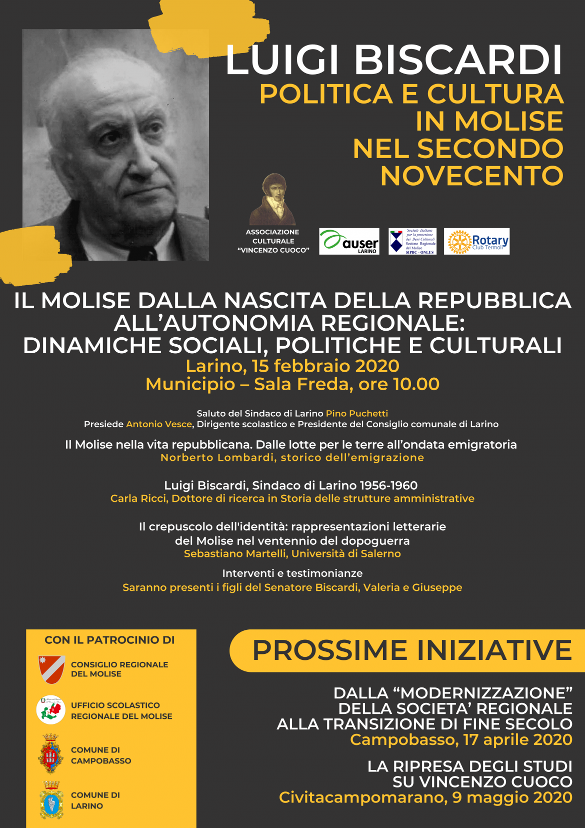Non una commemorazione ma tre momenti di riflessione sulla politica e la cultura in Molise nel secondo novecento, ripercorrendo i momenti della vita del senatore Luigi Biscardi e i suoi molteplici impegni per la modernizzazione della nostra regione e del Mezzogiorno.