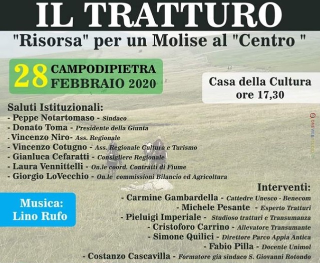 Il “Tratturo“ RISORSA per un Molise al ‘Centro’ è questo il titolo di un interessante convegno che si terrà a Campodipietra, presso la Casa della Cultura, il 28 febbraio 2020 a partire dalle 17,30.