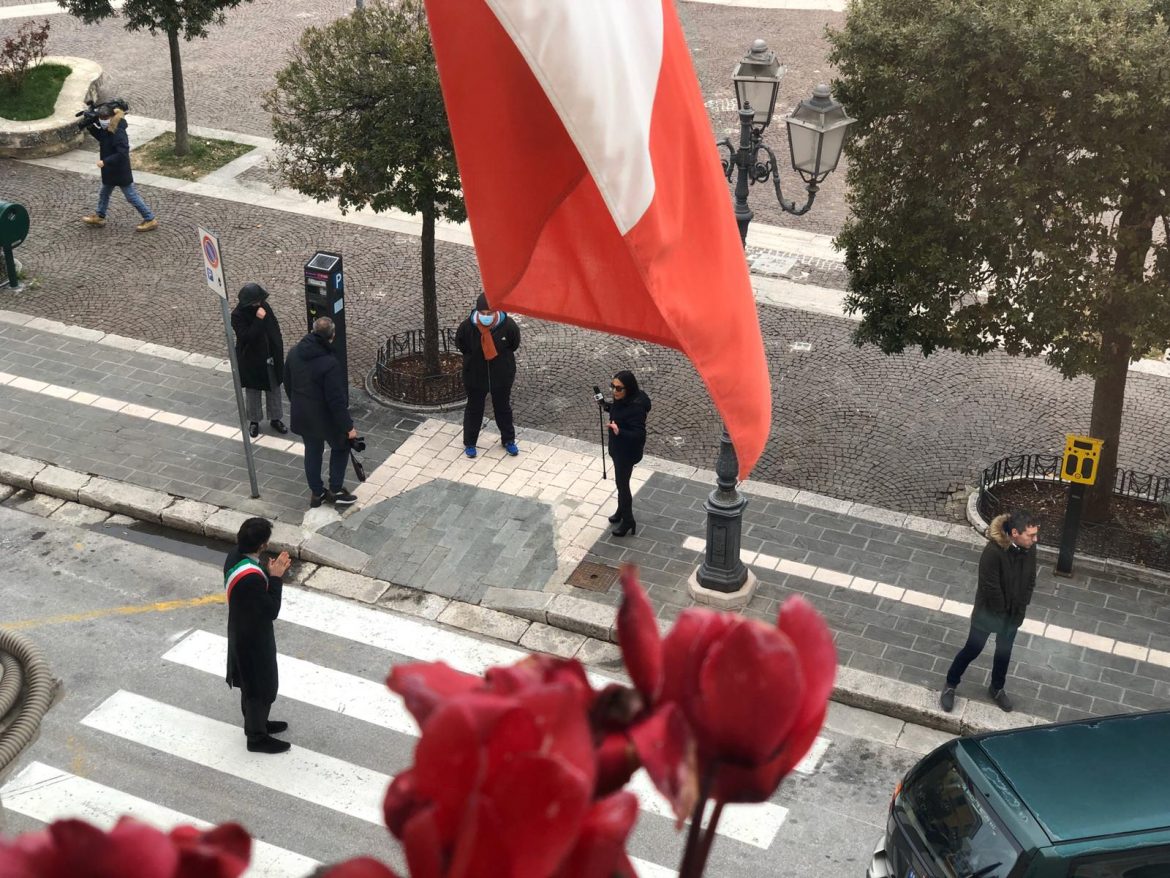 Il sindaco Roberto Gravina davanti al Palazzo di Città per ascoltare in ossequioso silenzio il brano ‘Il Silenzio’, scandito dal suono della tromba.