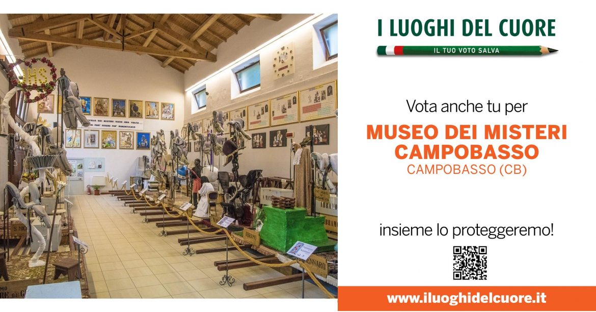 Ognuno di noi è emotivamente legato a luoghi unici che rappresentano una parte importante della nostra vita e che vorremmo fossero protetti per sempre, come il Museo dei Misteri e gli “Ingegni” che ne custodisce, un modo per valorizzare il Museo che siamo abituati a vivere ogni giorno, soffermandoci sul valore della sua presenza nella nostra quotidianità e nel territorio in cui viviamo. Il Museo dei Misteri di Campobasso, grazie all’Associazione Misteri e Tradizioni, è candidato tra “I Luoghi del Cuore” della FAI, il Fondo Ambiente Italiano, in collaborazione con Intesa San Paolo, per riscoprire, valorizzare e tutelare il patrimonio monumentale, artistico e paesaggistico del nostro Bel Paese. Giunto alla sua decima edizione, il censimento del FAI permette di scegliere “I Luoghi del Cuore”, tra i luoghi del vastissimo elenco di tesori del territorio italiano, tra cui anche il Museo dei Misteri di Campobasso, e nuovi siti di particolare rilevanza storica, architettonica e artistica da valorizzare.