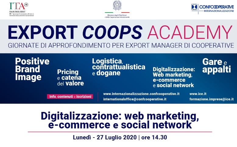 Restando in ambito formativo, per lunedì 27 luglio è stato organizzato un webinar dal titolo ‘Digitalizzazione: web marketing, e-commerce e social network’. Un corso studiato in modo particolare per le aziende cooperative con l’obiettivo di rafforzare le capacità commerciali nei mercati esteri attraverso l’approfondimento di aspetti relativi alle tecniche di web marketing, alle vendite online e all’uso dei social.
