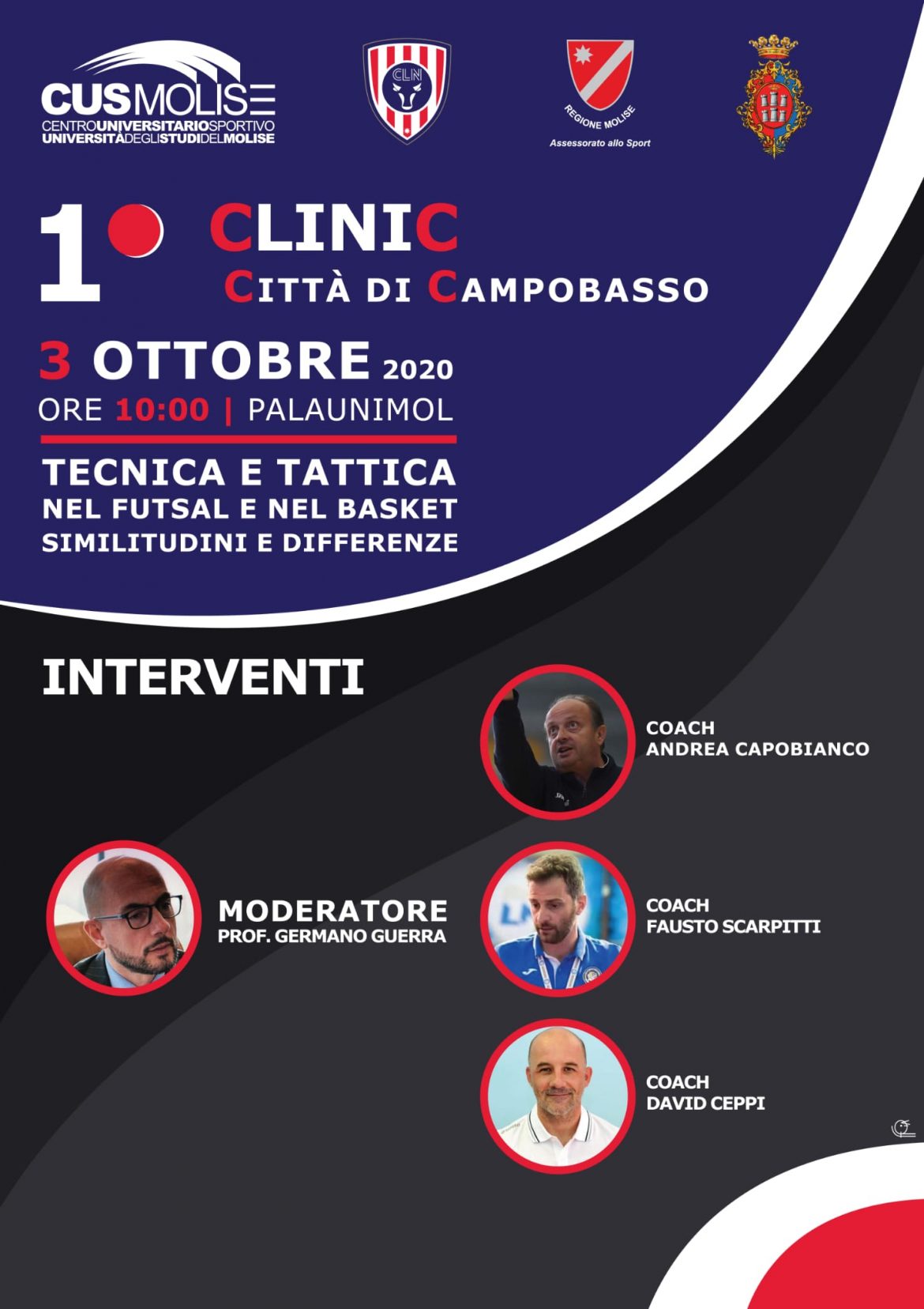 Il primo Clinic Città di Campobasso, in programma sabato 3 ottobre alle ore 10 al Palaunimol, dal titolo ‘Tecnica e tattica nel futsal e nel basket. Similitudini e differenze”, moderato dal professor Germano Guerra delegato dello sport per il rettore e medico sportivo, vedrà in cattedra relatori illustri, quali coach Andrea Capobianco, mister Fausto Scarpitti e mister David Ceppi.