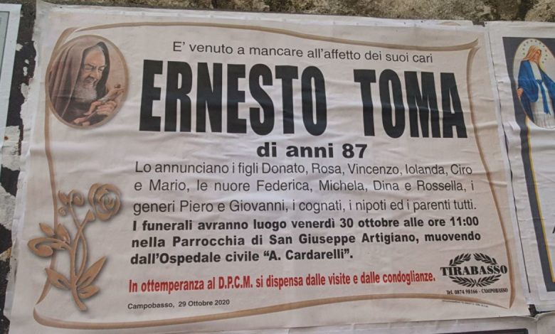 E’ venuto a mancare oggi, mercoledì 29 ottobre 2020, all’età di 87 anni, Ernesto Toma, padre del Presidente della Giunta regionale del Molise, Donato Toma. I funerali si terranno alle 11 di venerdì 30 ottobre 2020 nella Parrocchia di San Giuseppe Artigiano.