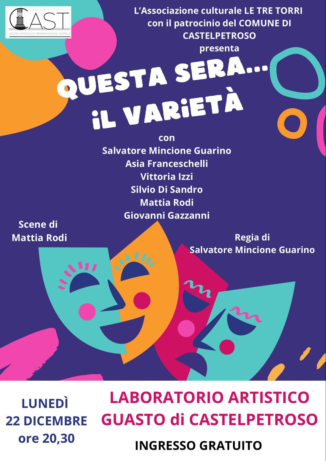 L’atmosfera del Natale diventa magica a Castelpetroso grazie all’associazione Le Tre Torri. I volontari, guidati dall’energica presidente Angela Farro, domani sera regaleranno alla cittadinanza una serata all’insegna del divertimento. A partire dalle ore 20:30 nella sede del Laboratorio artistico di Guasto, frazione del popoloso comune dell’hinterland isernino, sarà messo in scena lo spettacolo ‘Questa sera… Il Varietà’.