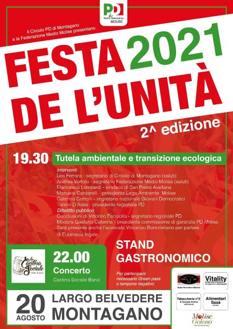 Transizione ecologica e tutela ambientale saranno i temi alla base della Festa de L’Unità che si terrà a Montagano, Largo Belvedere, venerdì 20 agosto.