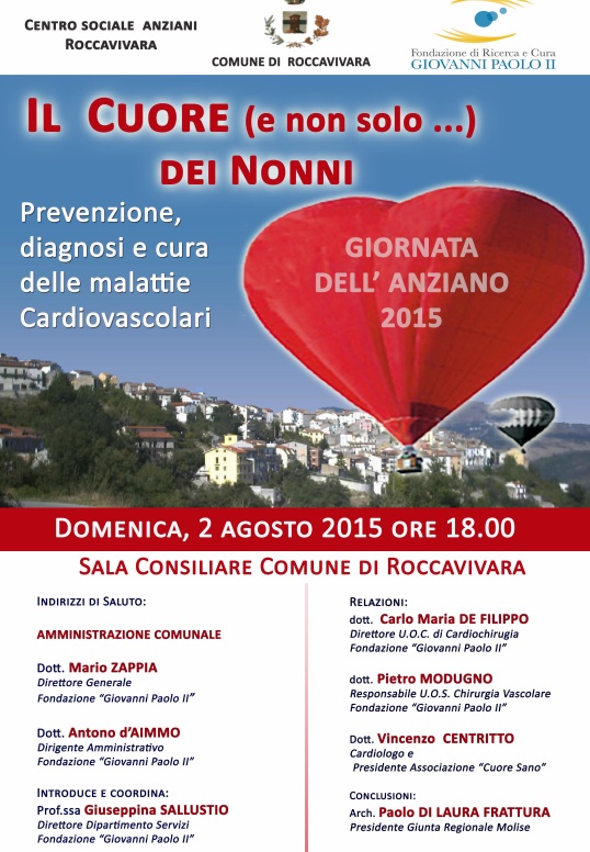 La ‘Giornata dell’anziano’ è diventata un appuntamento annuale dell’estate a Roccavivara, piccolo centro dell’Alto Molise che annovera “tra i suoi figli” anche la professoressa Pina Sallustio, Direttore del Dipartimento Servizi della Fondazione e professore dell’Università Cattolica del Sacro Cuore, che ha vissuto tanti anni a Roma per poi tornare in Molise e dar vita al reparto di Radiodiagnostica della Cattolica di Campobasso. Quest’anno l’evento verrà celebrato domenica 2 agosto dalle ore 18, presso la Sala Consiliare, con un convegno sul tema: “IL CUORE (E NON SOLO) DEI NONNI … prevenzione diagnosi e cura delle malattie cardiovascolari”, organizzato dal Comune, dalla Fondazione “Giovanni Paolo II” e dal Centro Sociale Anziani.