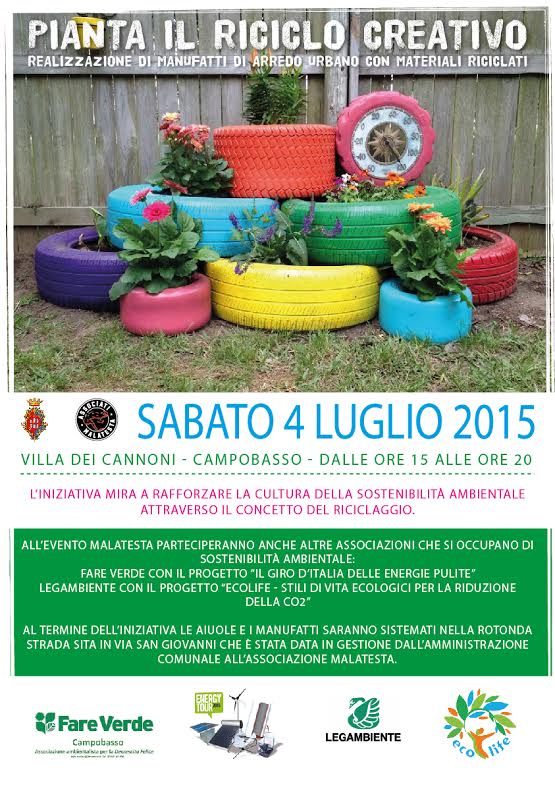 Si svolgerà domani, sabato 4 luglio 2015, dalle 15 alle 20, in Villa dei Cannoni (di recente denominata Villa Musenga) a Campobasso, l’evento ‘Pianta il riciclo ricreativo – realizzazione di manufatti di arredo urbano con materiali riciclati’.