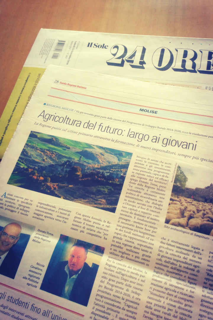 Così come anticipato da CBlive, il Molise è oggi, 24 settembre, sul’inserto che IlSole24Ore, dedica alle regioni. A pagina 28 e 29 di ‘Scenari’ l’approfondimento su agricoltura e turismo rurale, poi una serie di articoli che raccontano il fascino dei borghi e dei tratturi e la qualità dei prodotti locali.