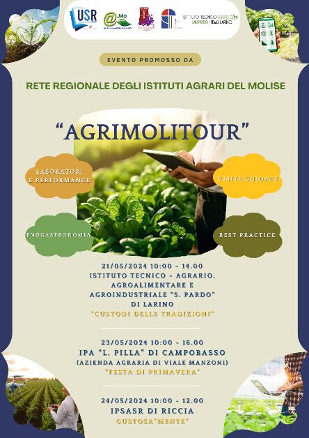 Tre appuntamenti per valorizzare le peculiarità degli Istituti Agrari molisani e promuovere le produzioni di eccellenza e le innovazioni in campo agrario ed enogastronomico. Si chiama “Agrimolitour” l’evento itinerante promosso dall’Ufficio Scolastico Regionale per il Molise e dalla Rete Regionale degli Istituti Agrari in programma in tre scuole molisane dal 21 al 24 maggio 2024 in cui studenti e docenti saranno protagonisti di laboratori e performance, visite guidate, presentazioni di buone pratiche ed incontri enogastronomici. Il 21 maggio, in particolare, Agrimolitour toccherà l’Istituto Tecnico Agrario, Agroalimentare e Agroindustriale “S. Pardo” di Larino (dalle 10:00 alle 14:00) con l’iniziativa “Custodi delle tradizioni”. Il 23 maggio (dalle 10:00 alle 16:00), invece, l’Istituto Professionale Agrario “L. Pilla” di Campobasso ospiterà la manifestazione intitolata “Festa di primavera”. Le tre giornate si concluderanno, infine, il prossimo 24 maggio (dalle 10:00 alle 12:00) nella sede dell’IPSASR di Riccia con l’evento intitolato Gustosa”Mente”.