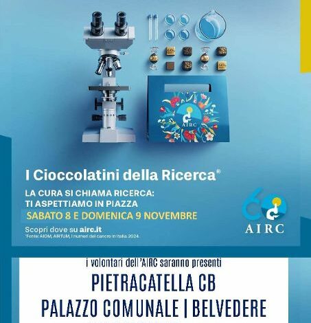 Anche quest’anno la comunità di Pietracatella rinnova la propria adesione alla grande campagna nazionale dell’AIRC con l’iniziativa “I Cioccolatini della Ricerca”, simbolo di solidarietà e di impegno civile nella lotta contro il cancro. I volontari locali saranno presenti presso le sale comunali di via Fontanelle e sul Belvedere sabato 8 novembre, dalle ore 17 alle 20, e domenica 9 novembre, dalle ore 10 alle 13, per offrire le eleganti confezioni di cioccolato fondente firmato Venchi, a fronte di una donazione minima di 15 euro.
