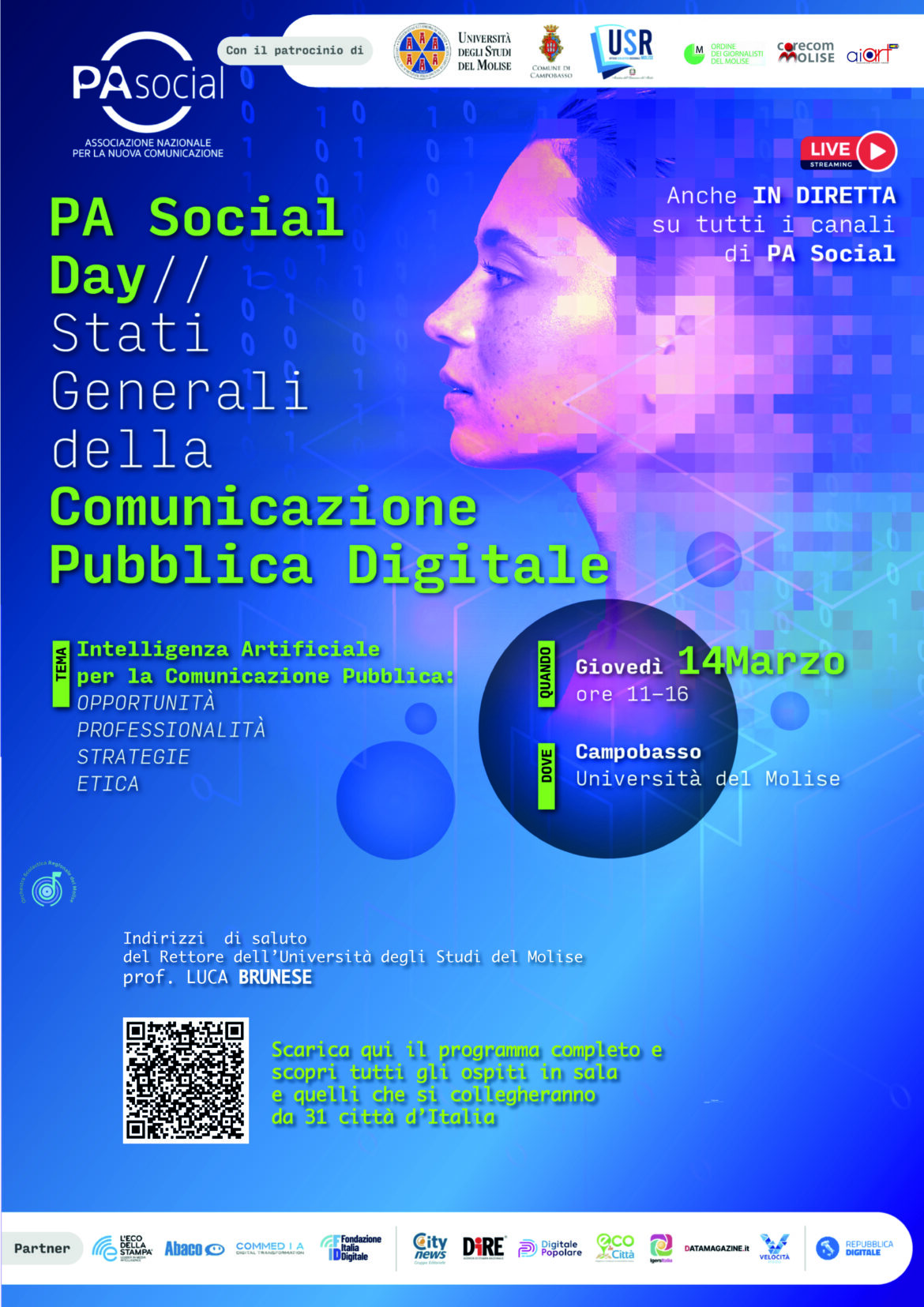 Il tema sarà l’Intelligenza artificiale per la comunicazione pubblica. Appuntamento giovedì 14 marzo, dalle ore 11:00 alle 16:00, nell’Aula Magna di Ateneo – Campus universitario Vazzieri – via Francesco De Sanctis, Campobasso, e in diretta da 31 città italiane e sui canali social Facebook, YouTube, LinkedIn, Twitch di PA Social.