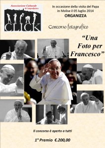 L’Associazione Culturale ‘Click’ a seguito della visita del Papa in Molise, ha comunicato i vincitori del concorso fotografico “Una Foto per Francesco”. Le opere pervenute sono state valutate dalla Giuria così composta: William MUSSINI (Presidente); Franco BORRELLI; Manfredi de SANTIS; Raffaele GIANFAGNA; Walter MUSSINI; Nicola PRESUTTI.