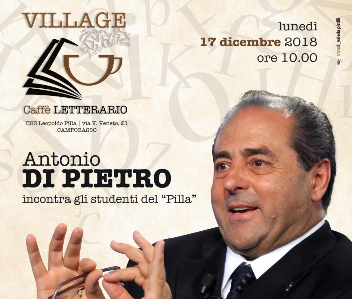Lunedì 17 dicembre alle 10,00 presso il Caffè letterario ‘Il Village’ dell’Istituto d’Istruzione Secondaria Superiore ‘Leopoldo Pilla’ di Campobasso l’ex magistrato di Mani Pulite, Antonio Di Pietro, incontrerà gli studenti della scuola di via Veneto.