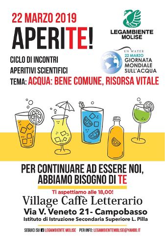 Si terrà domani, venerdì 22 marzo alle 18.00, al Village Caffè Letterario di Campobasso (Istituto Pilla – Via Vittorio Veneto 21), il nuovo appuntamento con gli aperitivi scientifici organizzati da Legambiente Molise, il ciclo di incontri di approfondimento che l’associazione ambientalista sta portando avanti in diversi locali di Campobasso. Al centro dell’incontro di domani ci sarà l’acqua, e di conseguenza tutto quello che ne deriva in quanto bene comune da tutelare.