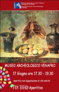 Cultura, storia e cibo saranno i protagonisti nel Museo Archeologico di Venafro, martedì 17 giugno 2014 dalle ore 17.30 in poi. L’evento promuove un percorso multi sensoriale attraverso una full immersion nella cultura dell’età romana. Oltre al piacere del gusto, deliziando i cibi antichi, si avrà il piacere visivo osservando le pietanze di Ercolano e Pompei e tra queste ci saranno i cibi carbonizzati nell’eruzione del Vesuvio.