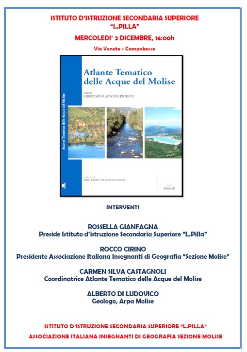 Sarà presentato il prossimo mercoledì 2 dicembre alle 16, nell’Aula Magna dell’Istituto d’Istruzione Secondaria Superiore ‘Pilla’ di Campobasso, L’Atlante Tematico delle Acque del Molise, a cura di Carmen Silva Castagnoli.