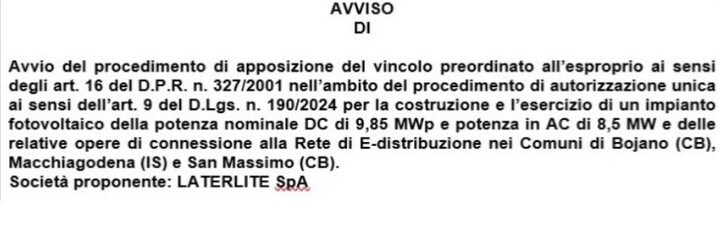 • la Società LATERLITE S.P.A. (P.IVA 02193140346), con sede in Solignano (PR), (frazione: Rubbiano) via Vittorio Veneto n. 30, ha presentato in data 31/07/2024 istanza di autorizzazione unica ai sensi dell’art. 12, D.Lgs. 387/2003 (di cui al prot. n. 107742 del 07/08/2024 della Regione Molise), per la costruzione e l’esercizio di un impianto fotovoltaico della potenza nominale DC di 9,85 MWp e potenza in AC di 8,5 MW e delle relative opere di connessione alla Rete di E-distribuzione nei Comuni di Bojano (CB), Macchiagodena (IS) e San Massimo (CB);