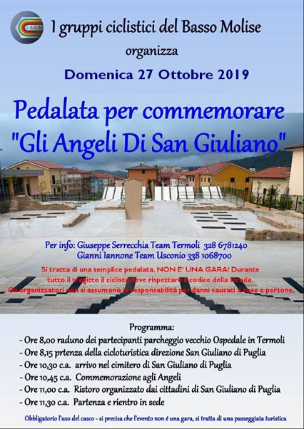 Domenica 27 ottobre 2019 i gruppi ciclistici del Basso Molise organizzato una pedalata non competitiva per commemorare gli Angeli di San Giuliano a pochi giorni dalla giornata della memoria che ricorrerà il prossimo 31 ottobre.