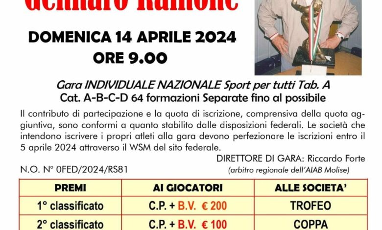 34 atleti al via suddivisi in 19 gironi eliminatori prenderanno parte, dalle ore 9 di domenica 14 aprile 2024, al 3° Trofeo Gennaro Rainone, gara nazionale di bocce, Individuale Nazionale, organizzata dall’ASD DLF Isernia e dalla famiglia Rainone.