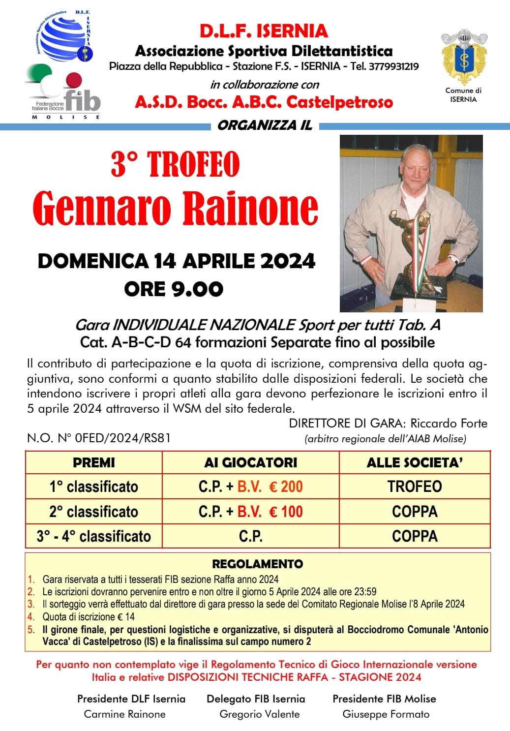 Il Trofeo Gennaro Rainone, dal 2022 manifestazione del calendario gare federale, ricorda l’imprenditore isernino, grande appassionato e sopraffino giocatore di bocce, il quale, per decenni, ha difeso i colori dell’ABC Castelpetroso.