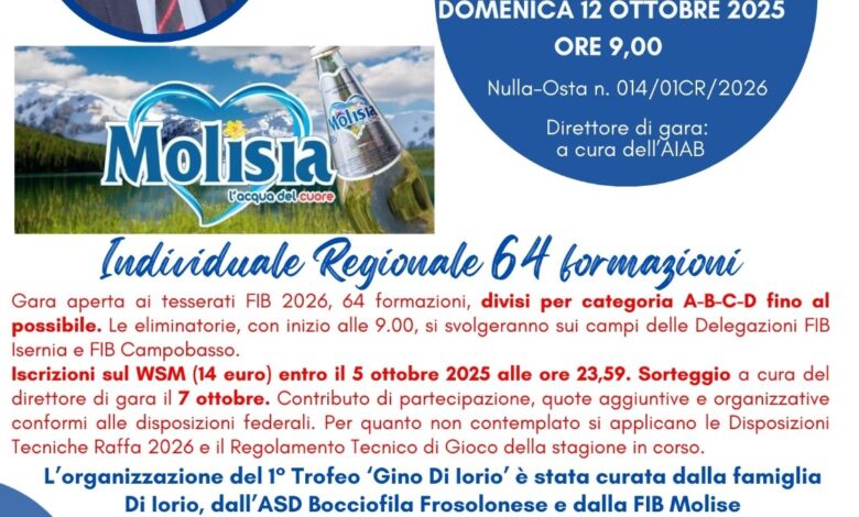 Cento gli atleti al via del 1° Trofeo ‘Gino Di Iorio’ – Trofeo ‘Molisia’, gara di bocce, individuale regionale, organizzata dalla Bocciofila Frosolonese del presidente Pasquale Mangione e dalla famiglia Di Iorio, col supporto di Clemente Di Bartolomeo e Gregorio Valente, in programma dalle ore 9 di domenica 12 ottobre 2025.