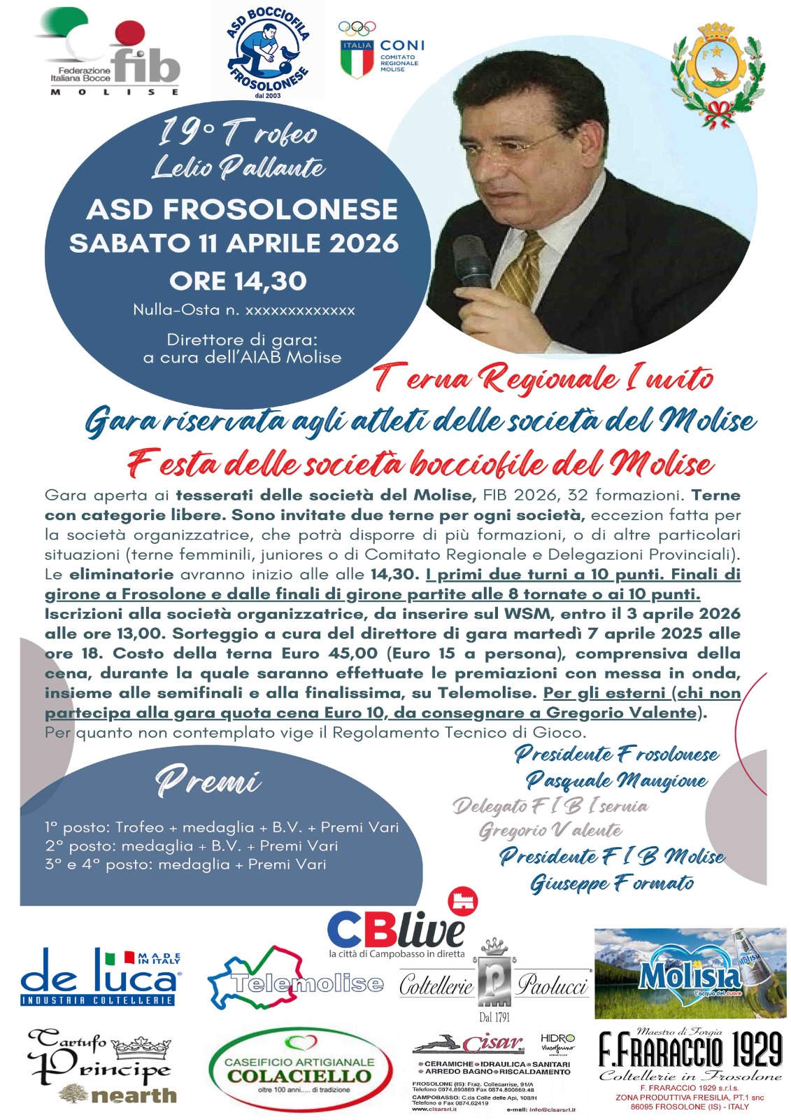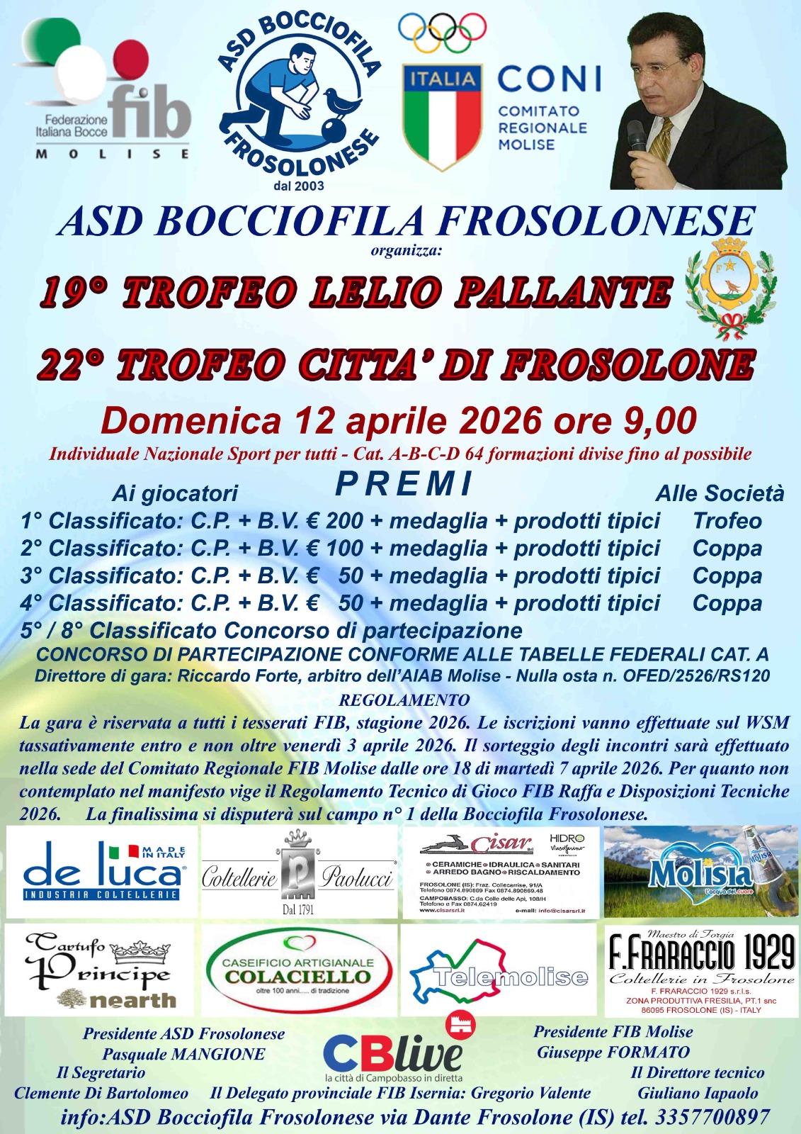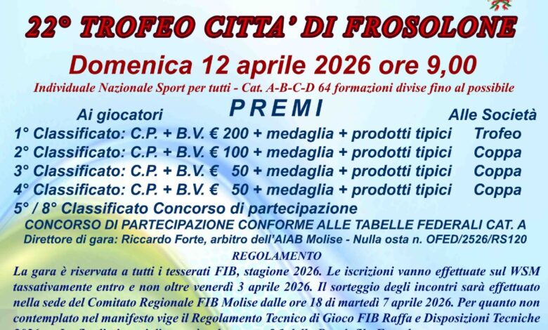 Grandi numeri anche per l’edizione 2026 della gara Nazionale, in programma sabato 11 e domenica 12 aprile 2026, organizzata dall’ASD Frosolonese del presidente Pasquale Mangione, dal delegato provinciale FIB Isernia Gregorio Valente, col supporto del presidente della FIB Molise, Giuseppe Formato.