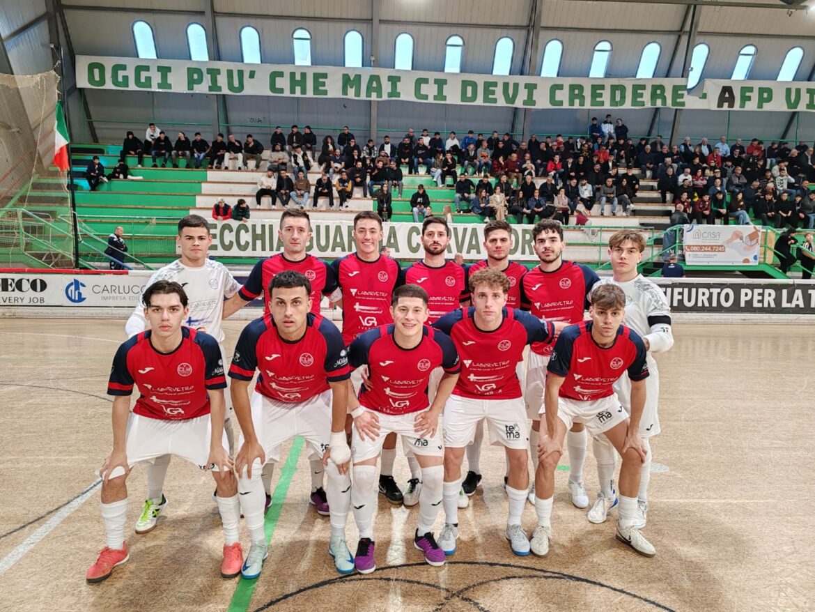 I pugliesi non ci stanno: Divanei illumina per Di Fonzo che mette al centro, Palumbo conclude a botta sicura, Soto si immola e manda in angolo. Rischiano gli ospiti quando Oliveira sale palla al piede e calcia, Di Benedetto intercetta la sfera e conclude verso la porta sguarnita, cuoio fuori di poco. I ragazzi di Sanginario trovano il tris subito dopo: Oliveira va al rinvio lungo, sfera sul palo e De Nisco, ben appostato, deve solo appoggiare in rete il pallone. La reazione del Giovinazzo è veemente. Di Fonzo recupera palla salta tre avversari e mette al centro dove Di Benedetto non sbaglia e riporta i suoi a meno uno.